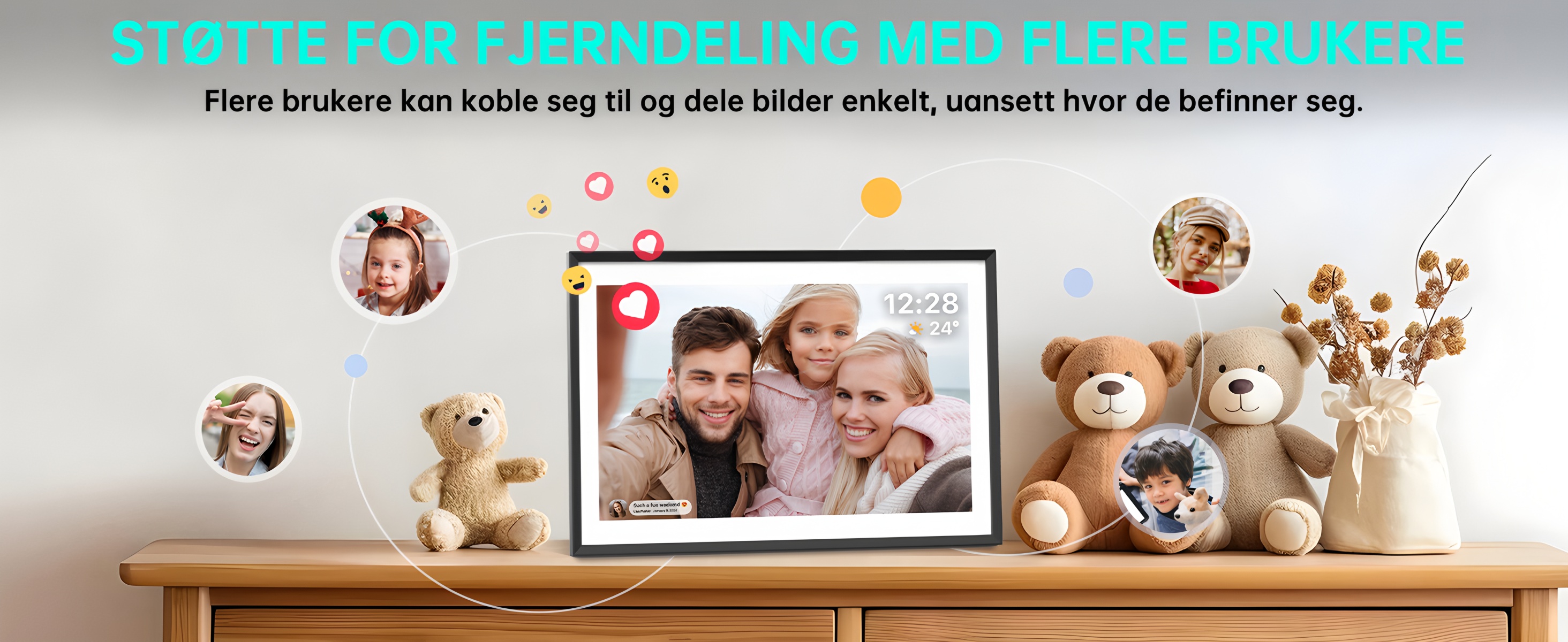 Med integrert Wi-Fi er det enkelt å koble seg til smarttelefonen og dele innhold fra fjerntliggende steder. Del dine bilder og videoer direkte til det digitale fotoframen – uansett hvor du er – slik at familien alltid kan oppleve dine vakreste øyeblikk sammen med deg. Flere brukere kan dele innhold, og bildeserien oppdateres automatisk – glede er alltid til stede.